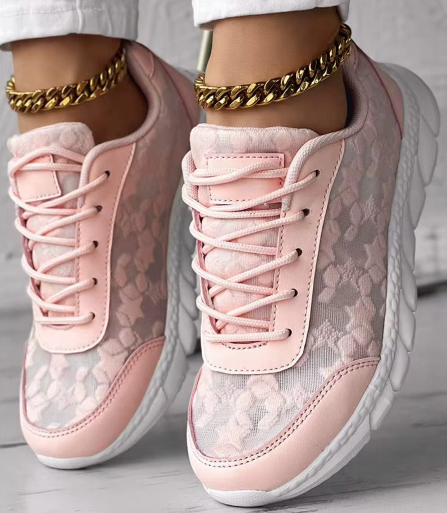 Step into a beautiful balance of charm and comfort with the Elorene BlossomStep Lace Sneakers. These breathable, floral lace mesh sneakers offer a feminine touch to your everyday look — lightweight, stylish, and versatile enough for both errands and evening strolls.